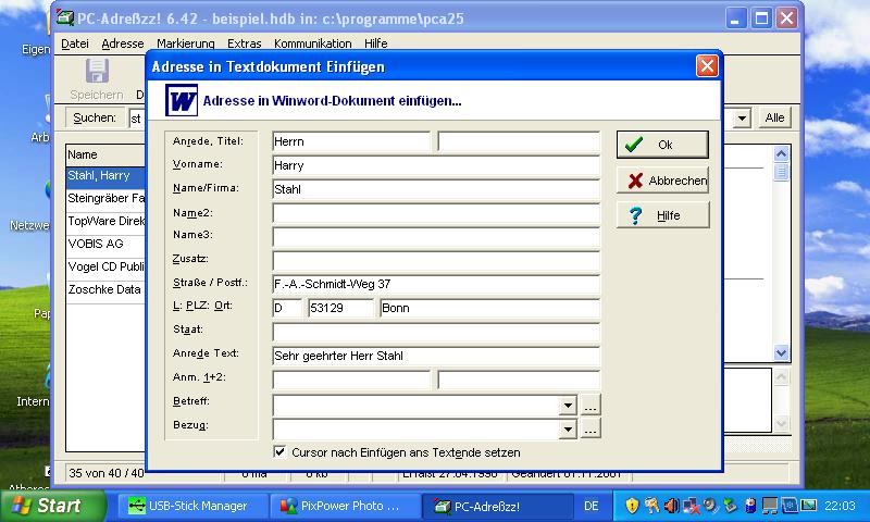 Hier der Dialog zum Einfügen einer Adresse in Winword.