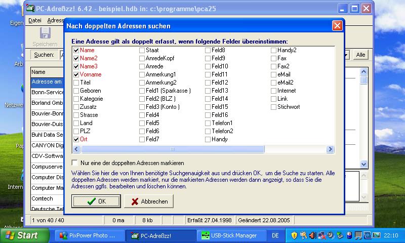 Und abschließend der Dialog zum suchen von doppelten Adressen. Alle Dialoge